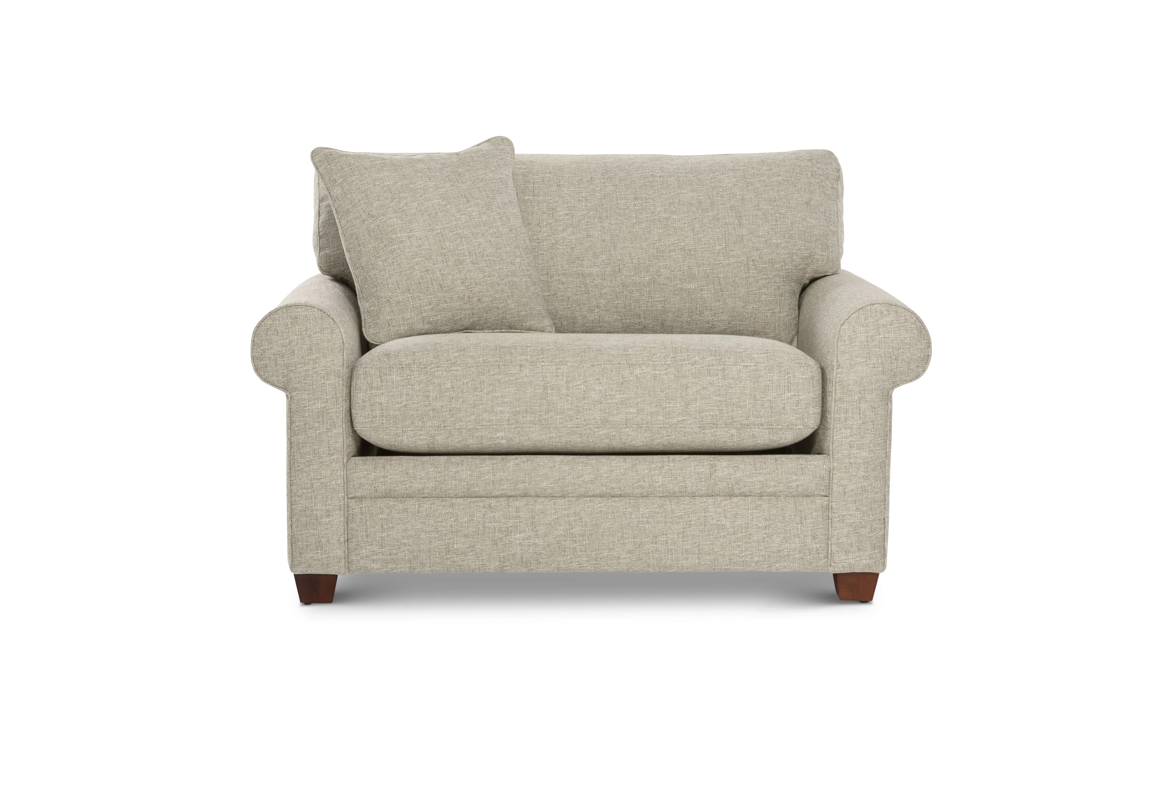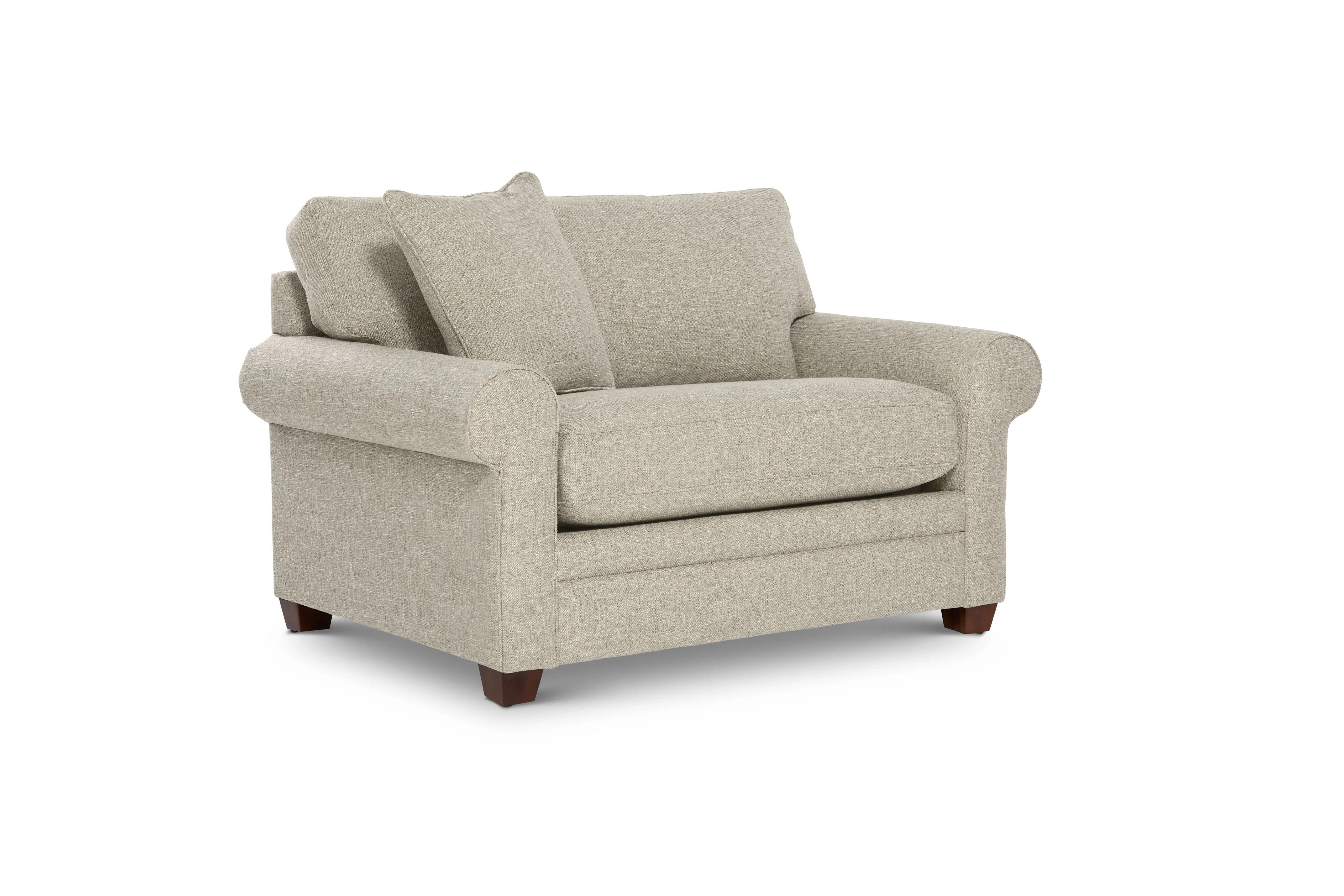 - Rolled arms, decorative wood legs and welt trim lend sophisticated style