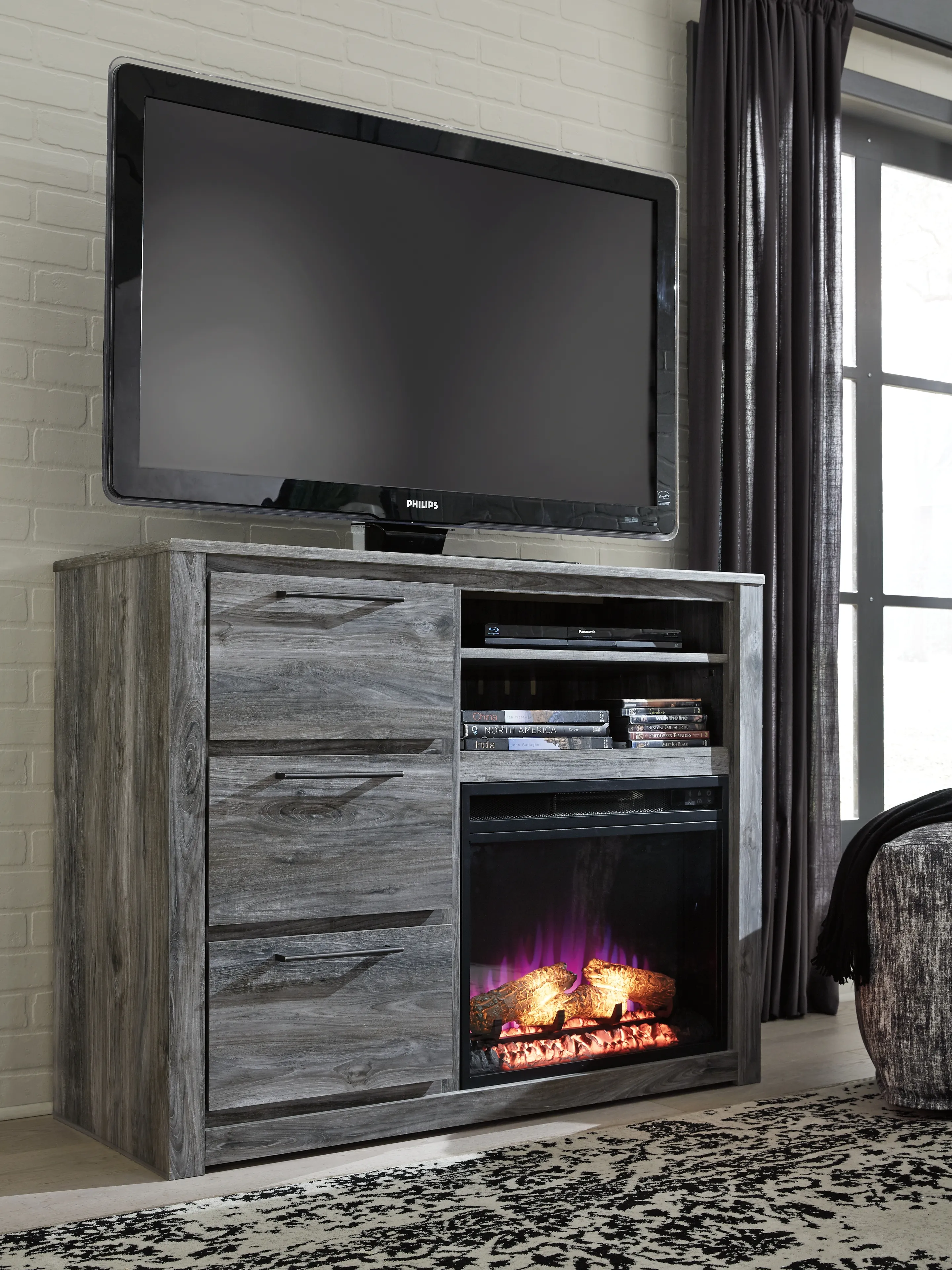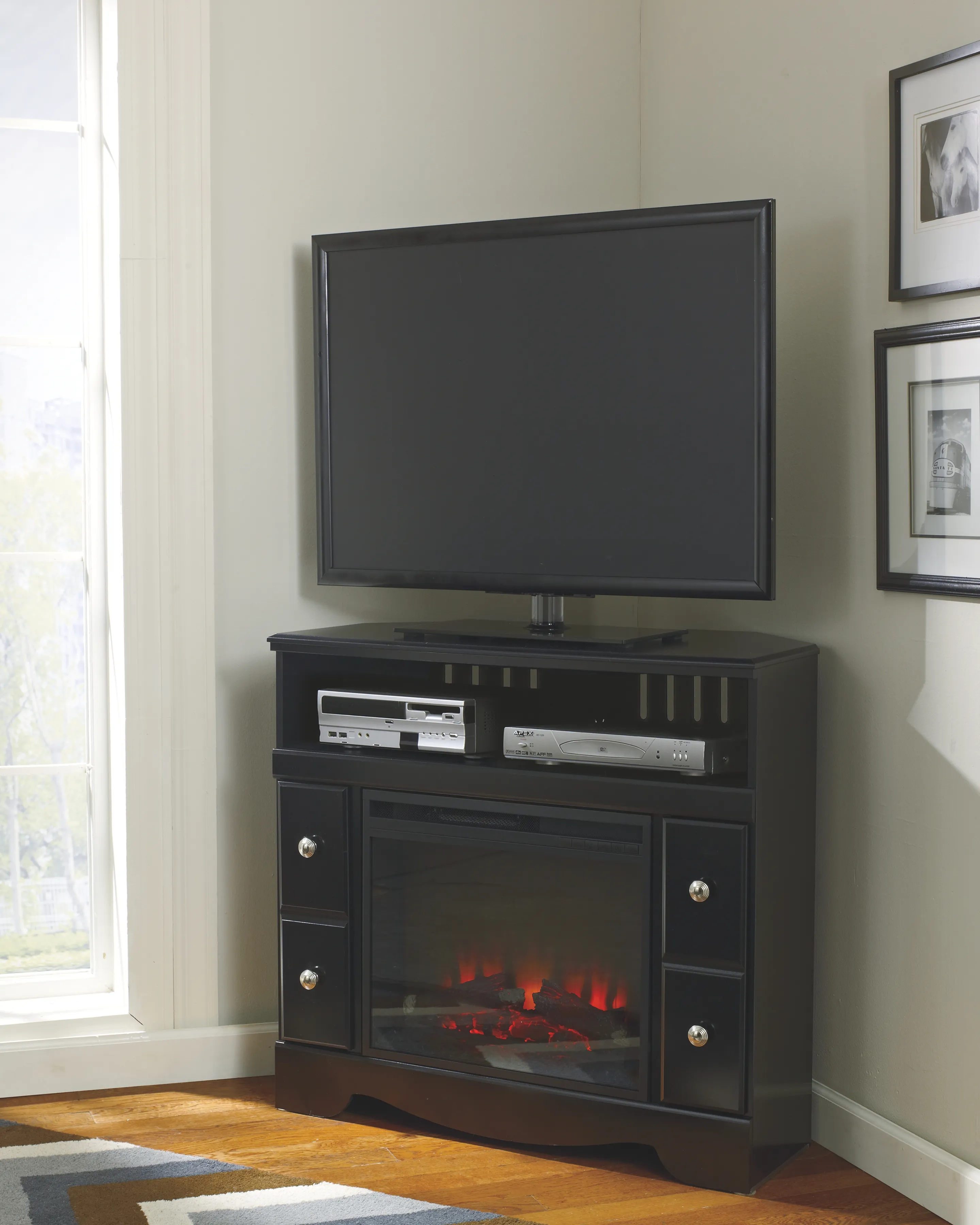 Enjoy the cozy feel of a cracklin' fireplace without the hassle, maintenance or cleanup. Available as an addition on select TV stands and entertainment centers, this fireplace insert includes an electric flame feature that operates with or without heat, six-level temperature setting, five levels of brightness and remote control-along with an overheating control device for added safety.