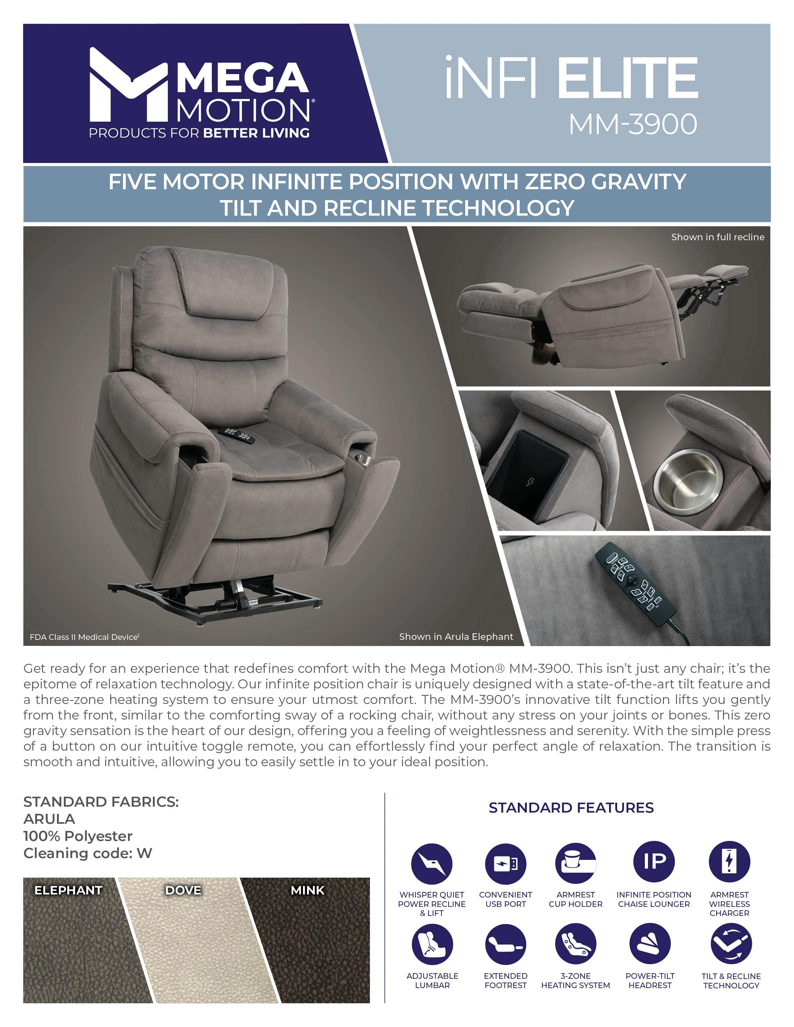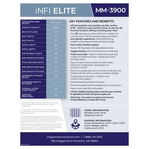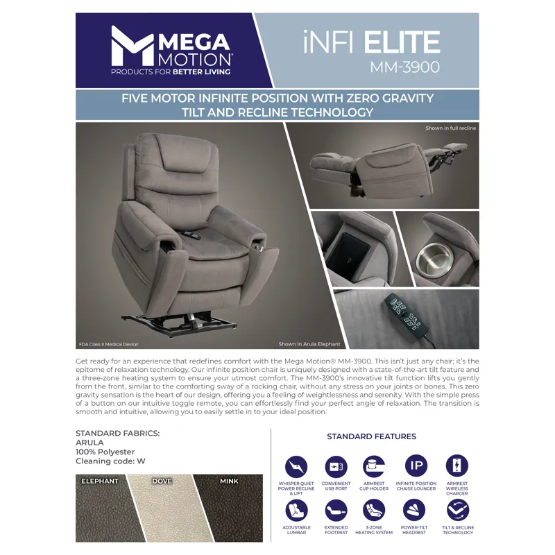 Are you ready for a Mega Motion experience unlike anything else? Then the MM-3900 is for you. What distinguishes this infinite position chair is our brand new tilt feature. Like a rocking chair, this tilt elevates you from the front, applying no extra pressure to the joints or bones while offering a true zero gravity experience.