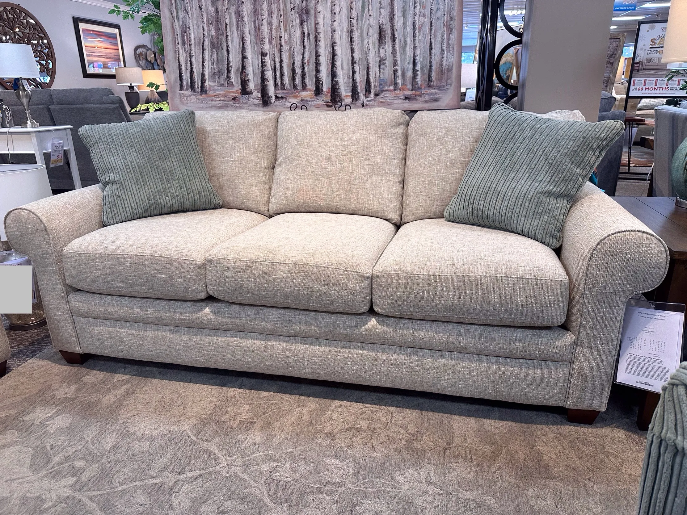 - Rolled arms, decorative wood legs and welt trim lend laid-back sophisticated style